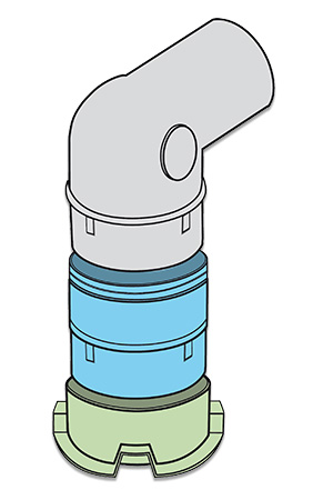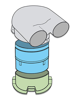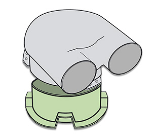 Filigrandecke: Der Flansch kann bereits dem Filigrandeckenbauer zum Eingiessen in die Filigrandecke gegeben werden. Dann kommt der Flanschs bereits montiert auf die Baustelle und der Installateur muss nur noch die Seitenkrallen des Zu-/Abluftknies abbrechen und das Knie in den Flansch einführen. So wird die Montage wesentlich erleichtert und geht sehr schnell vonstatten.